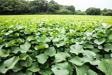 畑から採れたかんしょは天日干しで時間をかけながら干し芋になっていく